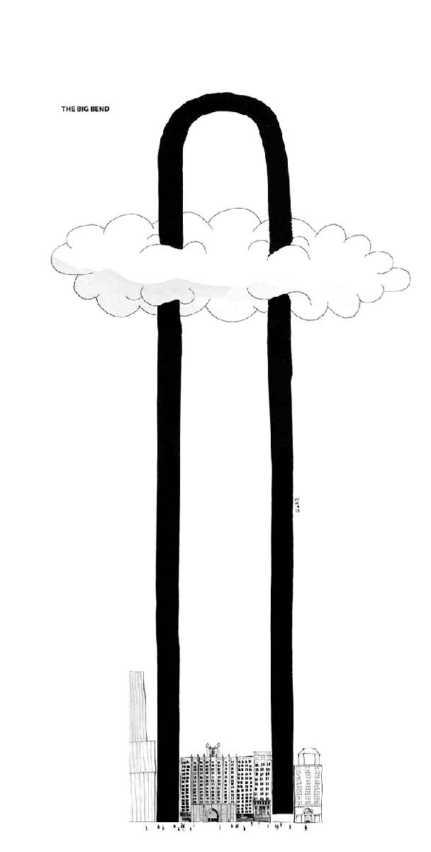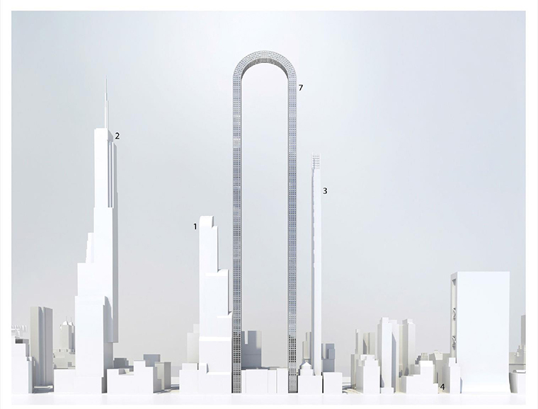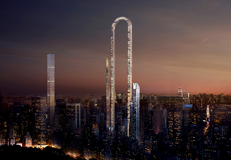 而就在曼哈頓57街,Oiio建筑機(jī)構(gòu)提出了一個(gè)“超長(zhǎng)摩天大樓”的設(shè)計(jì)概念,只是它把著眼點(diǎn)放在大樓的長(zhǎng)度上,而不是高度。這座建筑物自身彎曲成一個(gè)大拱門的形狀,看似兩棟實(shí)為一棟,而且頂部的彎曲區(qū)域也能住人。