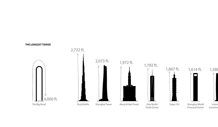 大樓呈一個(gè)巨大的“倒U型”,總長(zhǎng)4000英尺(約1219米),接近目前世界上最高大樓的兩倍。Oiio使用了最新的電梯技術(shù),允許電梯垂直和水平地通過(guò)建筑物的軸環(huán),同時(shí)也可以獨(dú)立使用。
