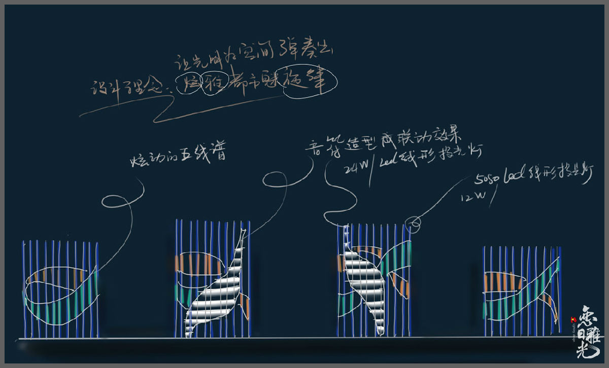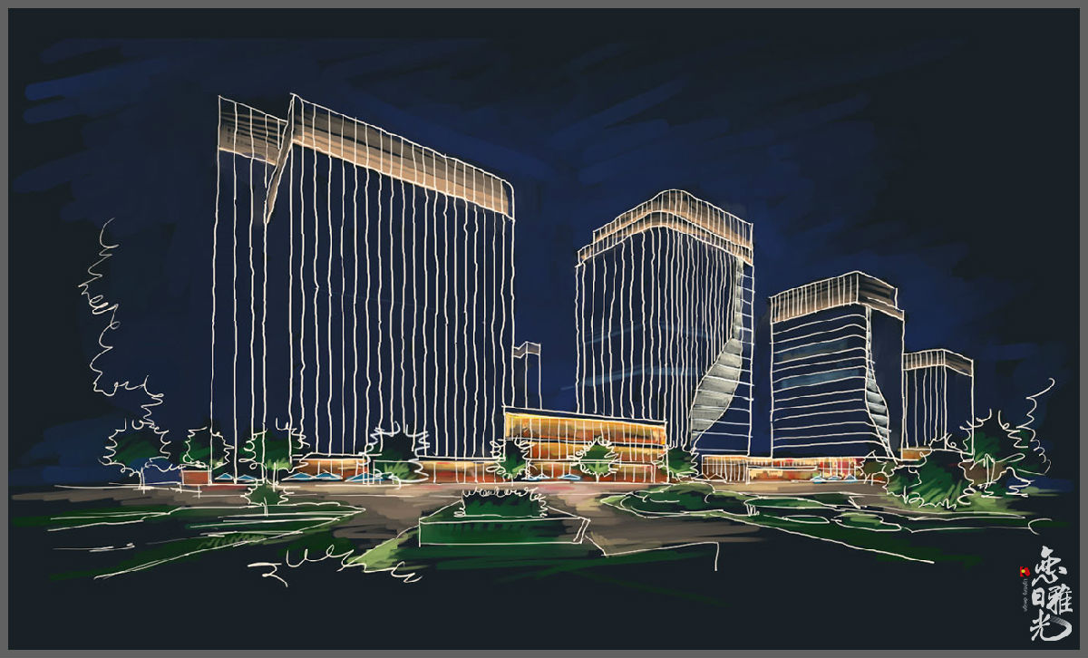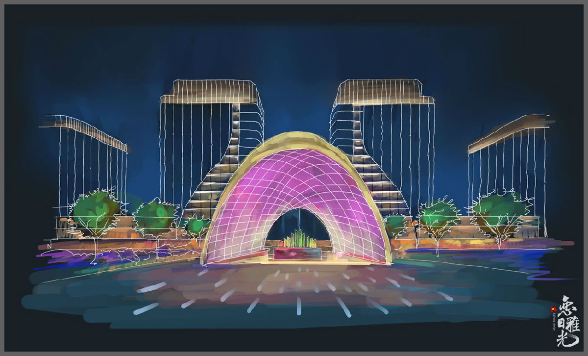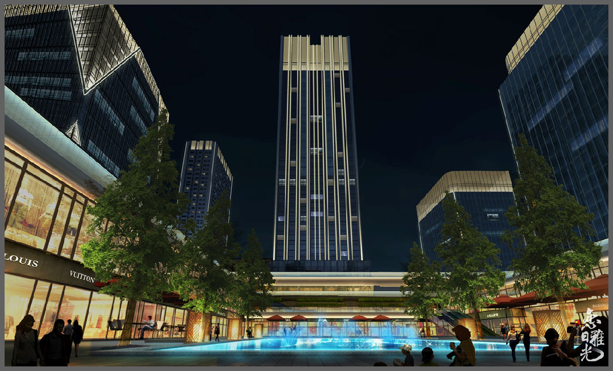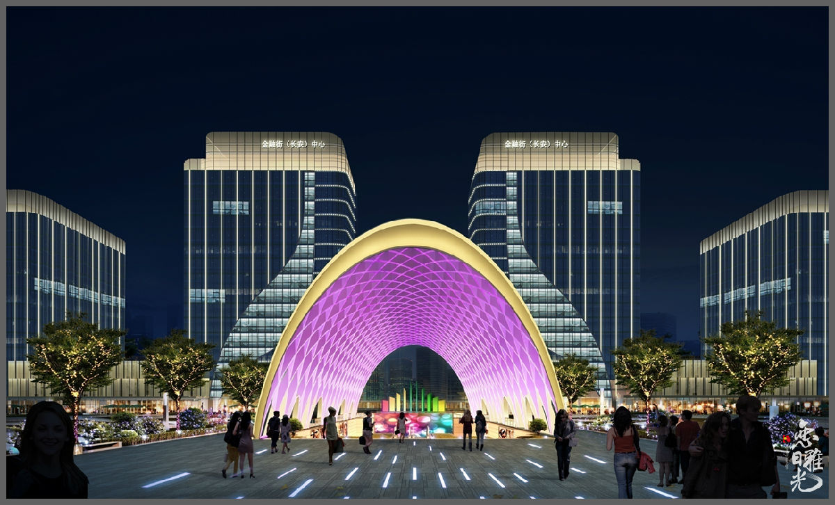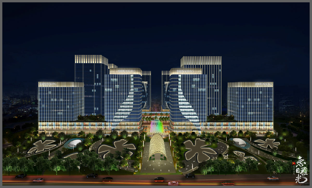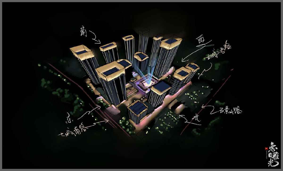 本次設(shè)計(jì)根據(jù)建筑形態(tài),把燈光與建筑相結(jié)合,做到人燈互動(dòng)。在建筑頂部形成天際線,突出項(xiàng)目的區(qū)域地標(biāo)性。建筑立面采用LED點(diǎn)