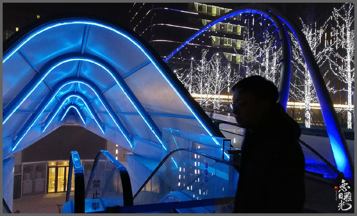 光源和數(shù)碼管相結(jié)合的照明手法,構(gòu)成點(diǎn)和線的對(duì)比組合,同時(shí)局部窗戶采用內(nèi)透手法,在視覺(jué)上形成一種律動(dòng)感。底商采用內(nèi)透光效果,