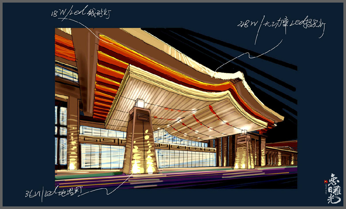 面結(jié)構(gòu)特征,采用LED洗墻燈體現(xiàn)敦煌民族文化的特色底蘊(yùn),構(gòu)畫(huà)出現(xiàn)代文明與精神文明交融共處、和諧發(fā)展的燈光意境。