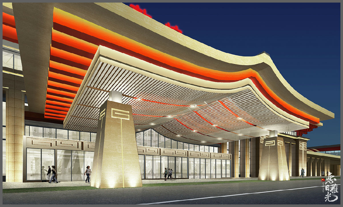 古漢唐遺韻,遠(yuǎn)遠(yuǎn)看去,仿佛一條條絲綢紐帶相連在一起,通過(guò)暖色調(diào)燈光表達(dá)出敦煌絲綢文化的內(nèi)涵所在。立面部分,捉住建筑立
