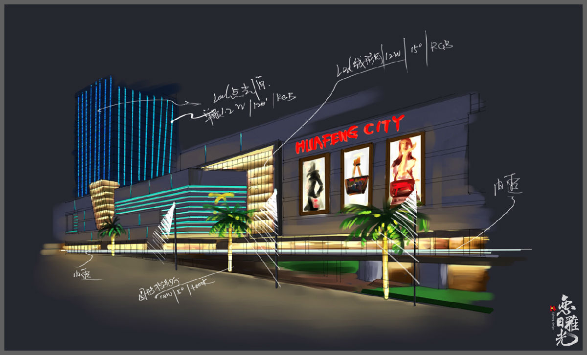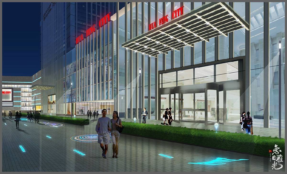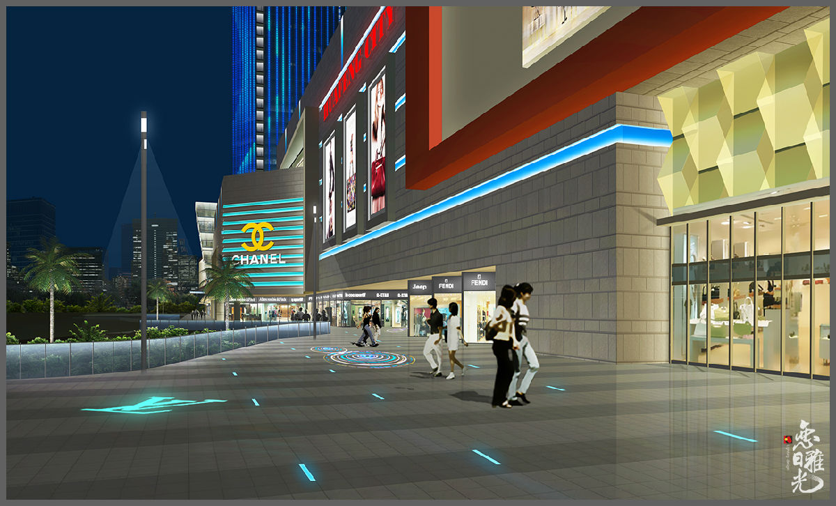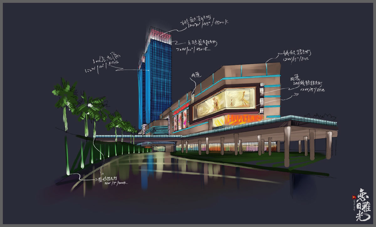 精髓,中部提取水文化元素來展示飛流直下的厚重感。底部通過照明手法的結(jié)合,虛實的對比,展現(xiàn)橫向流動線條,賦予裙樓商業(yè)靈動、