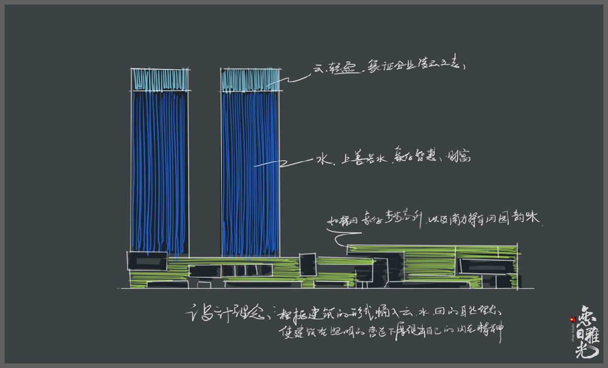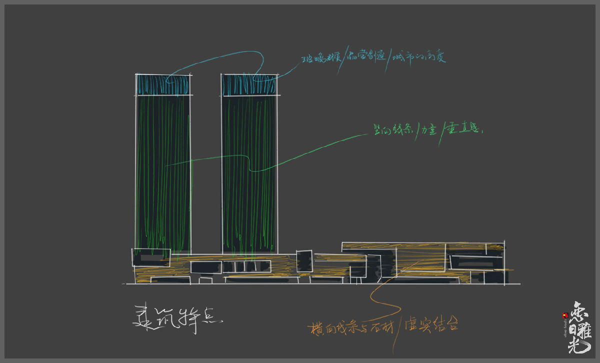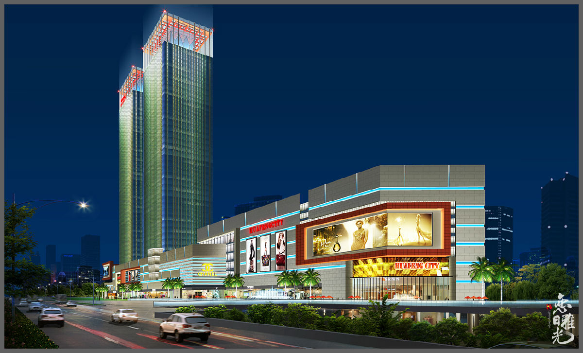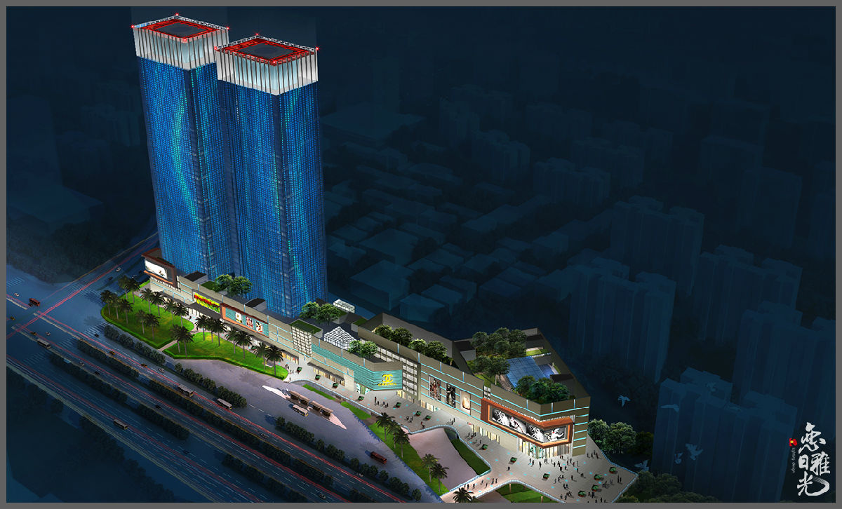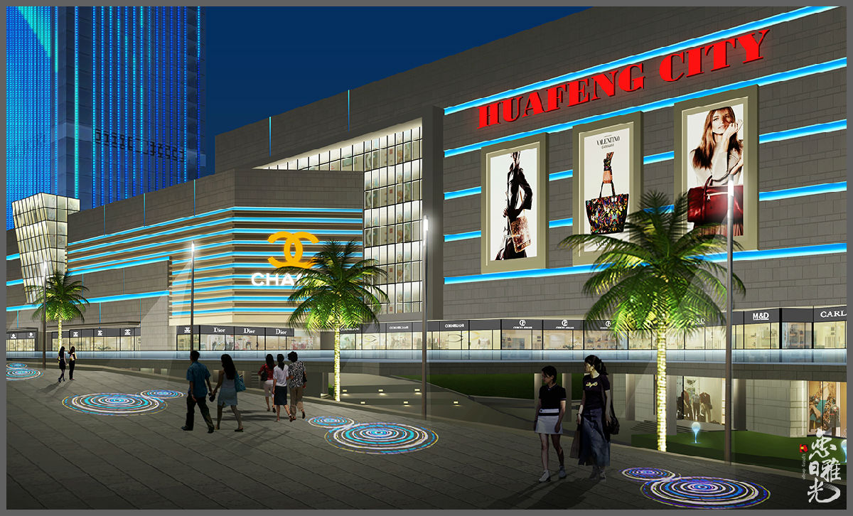 精髓,中部提取水文化元素來展示飛流直下的厚重感。底部通過照明手法的結(jié)合,虛實的對比,展現(xiàn)橫向流動線條,賦予裙樓商業(yè)靈動、