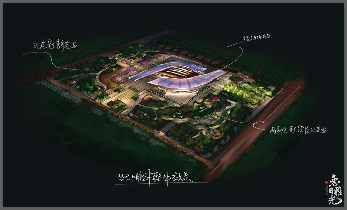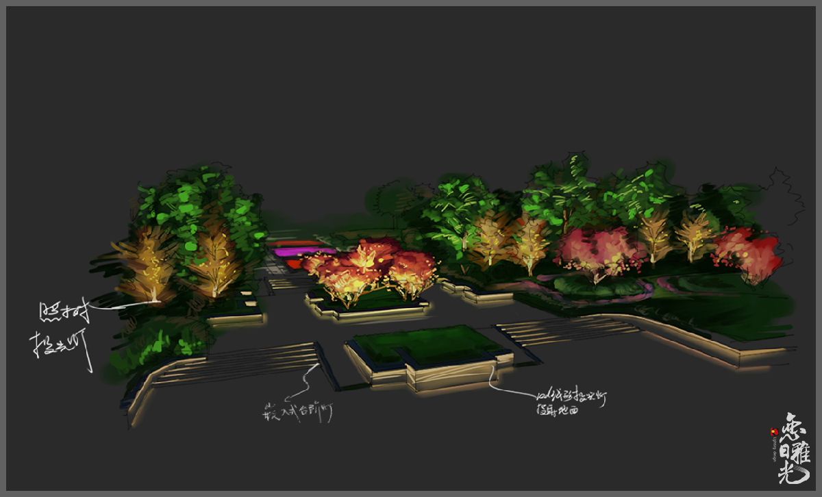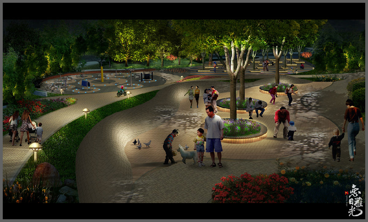 本案在固安城市要沖綠地的形象。以人文固安、科技固安為主題,結(jié)合燈光的照度、色溫、色彩關(guān)系,精準(zhǔn)控光,把控節(jié)點以及互動控制,來體