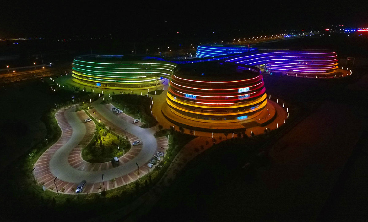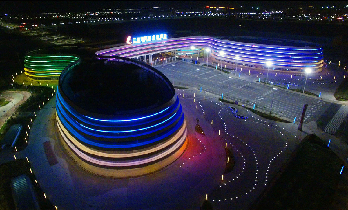 鳥瞰建筑猶如一只蝶靈騰空飛起,飛天鳳舞,絢麗多彩。夜幕下,如行云:時(shí)而嬉戲追逐,翻飛于萬綠叢中百花間,時(shí)而婆娑起舞,