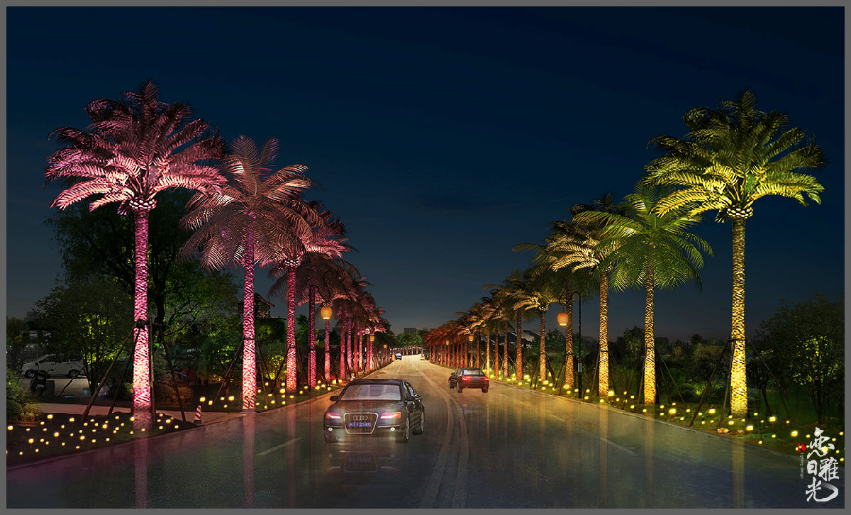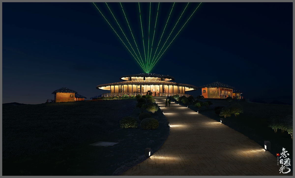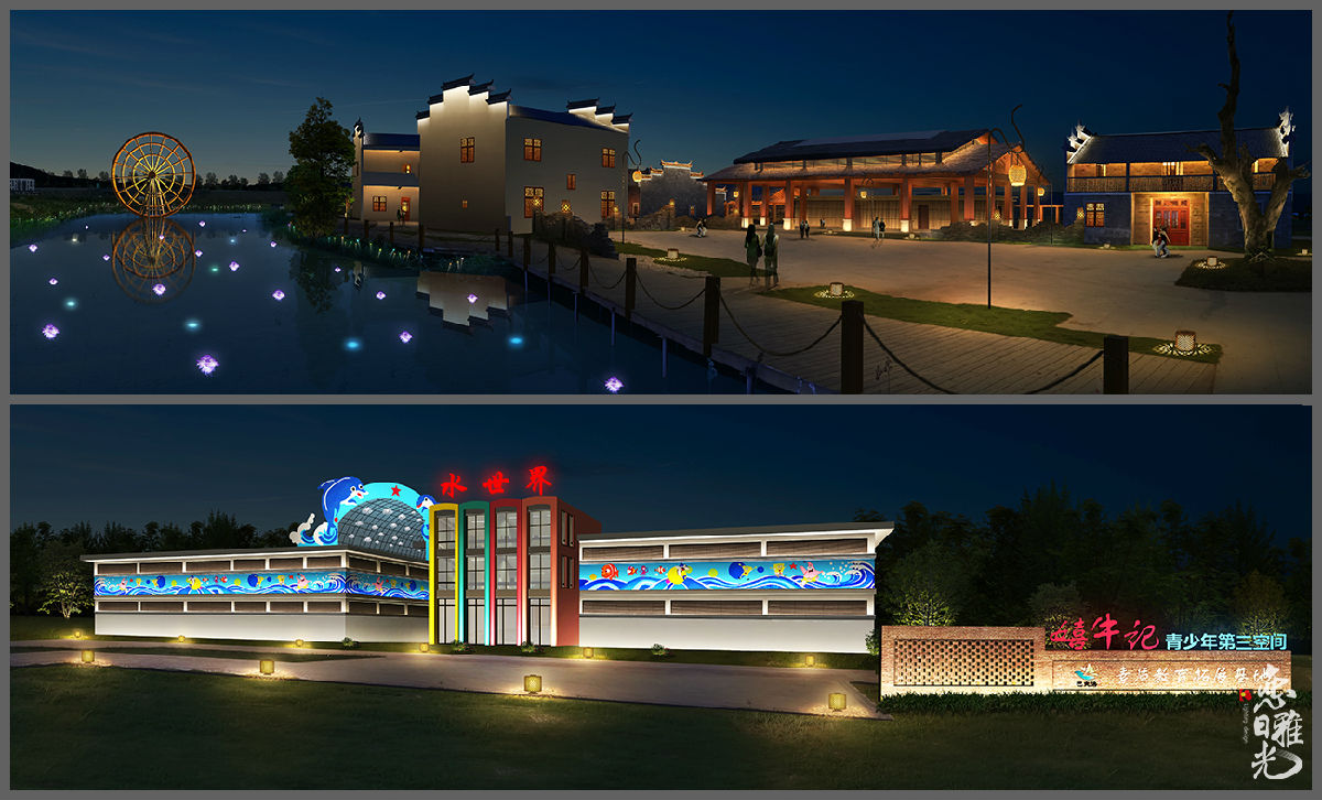 修飾,配合投影展現(xiàn)溫馨、活躍的氛圍。景觀部分采用RGB的燈具,燈光融入景觀,構(gòu)成一幅欣欣向榮的生態(tài)田園風(fēng)光。