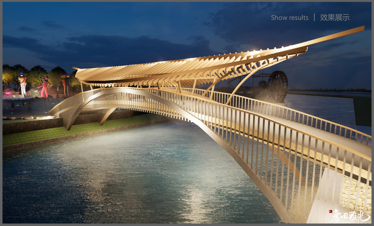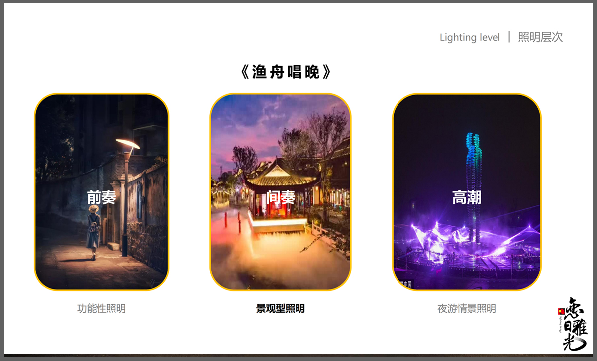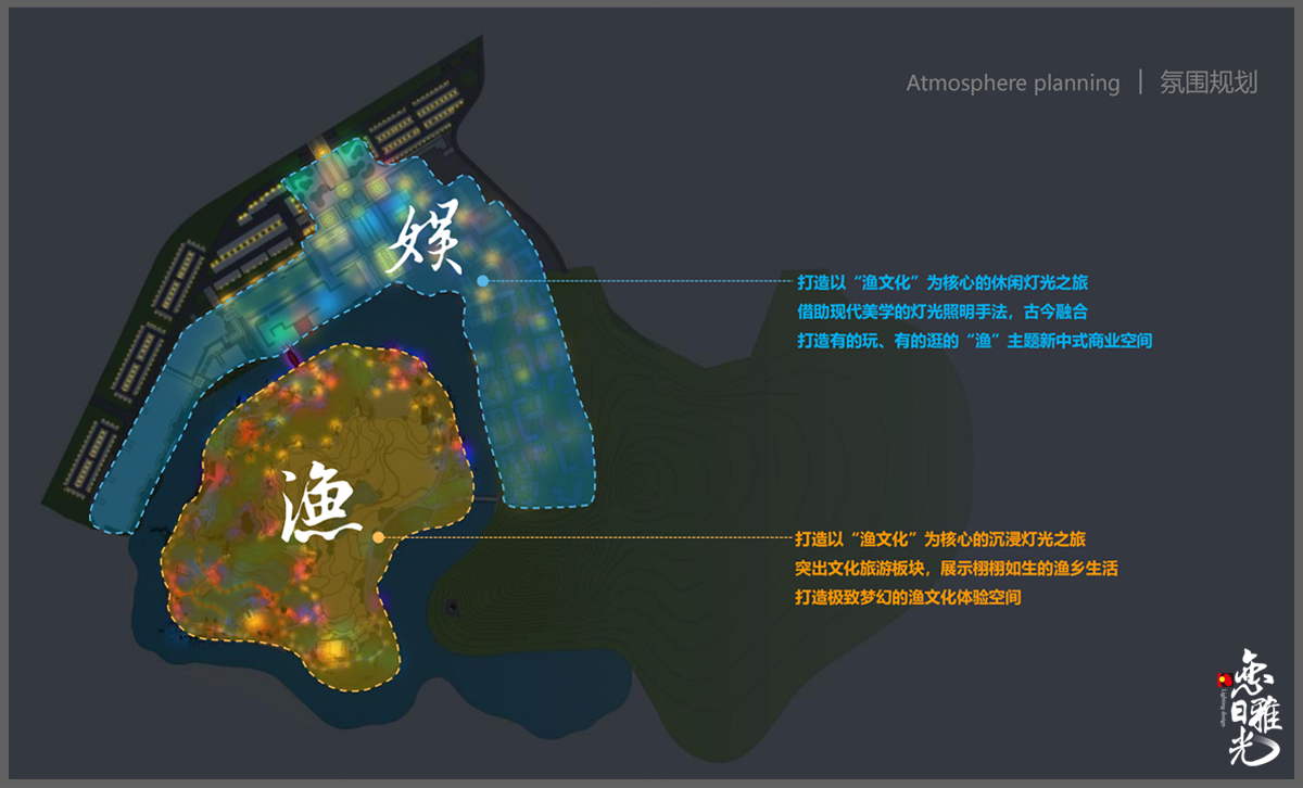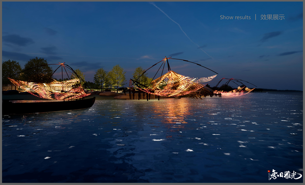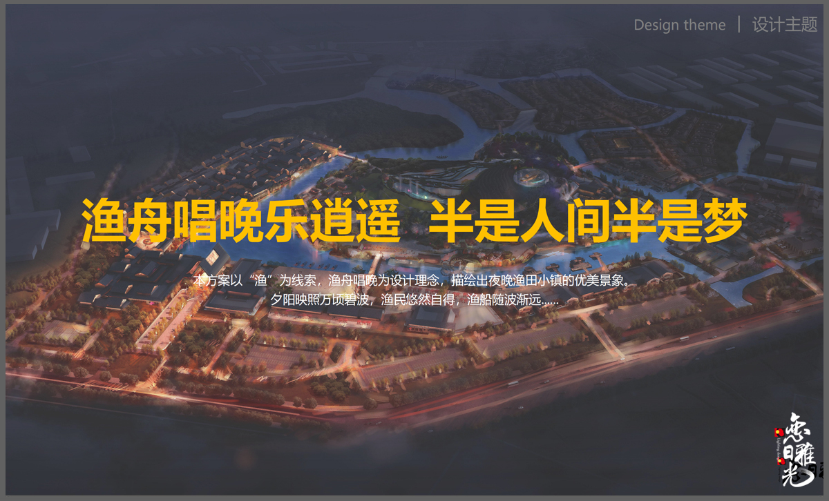 本方案以“漁”為線索,漁舟唱晚為設(shè)計理念,描繪出夜晚漁田小鎮(zhèn)的優(yōu)美景象。夕陽映照萬頃碧波,漁民悠然自得,漁船隨波漸遠(yuǎn)......